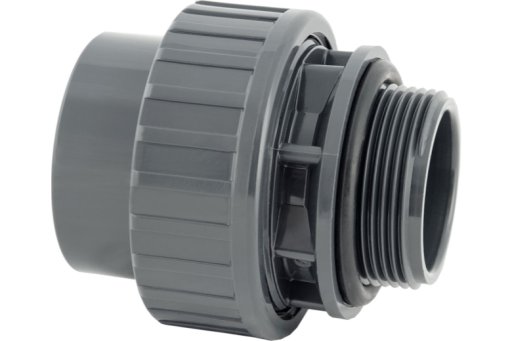 Webshop › Loodgieterij PVC › PVC koppelingen en buisklemmen › druk PVC 10 bar. 3-delige koppeling 63 mm lijmen, 2'' buitendraad